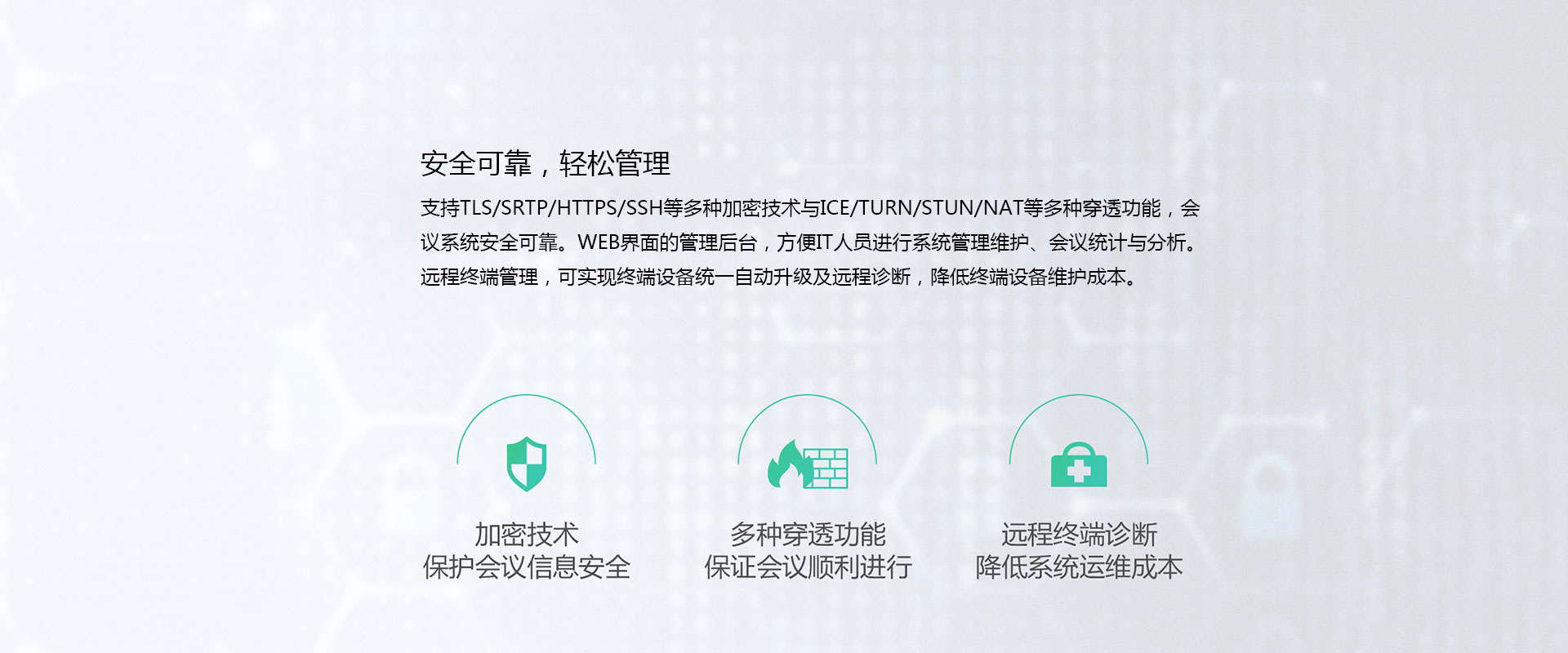 賬號注冊服務器:最多可支持10,000個注冊賬號;穿透服務器:ICE/TURN/STUN/NAT;有會議管理服務器:有會議管理服務器;企業地址簿服務器:企業地址簿自動同步到終端;